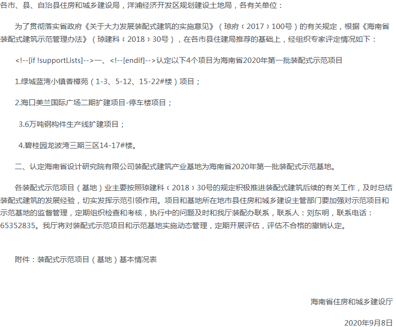 海南省住房和城鄉建設廳 關于認定海南省2020年第一批裝配式示范項目和示范基地的通知